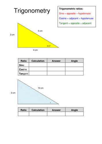 PDF Trigonometry Worksheet T1 - Labelling Triangles Trigonometry Worksheet T3 - Calculating Sides Work out the sides labelled. Questions 1 and 2 require Sine, questions 3 and 4 require Cosine, question 5 and 6 require Tangent. The rest …. you will need to work out which to use and how! (Worksheet T1 may help you!!) 1. 7. 2. 8. 3. 9. 4. 10. 5. 11. 6. 12.
